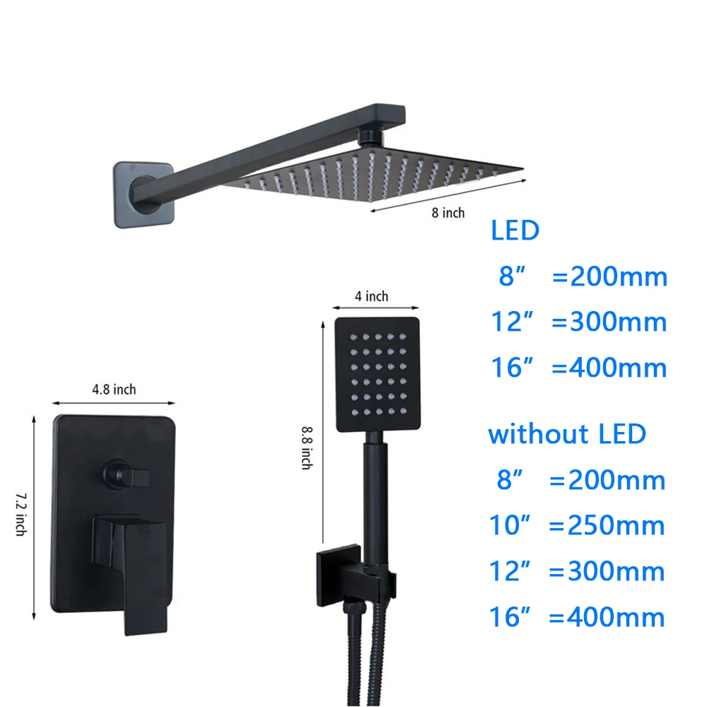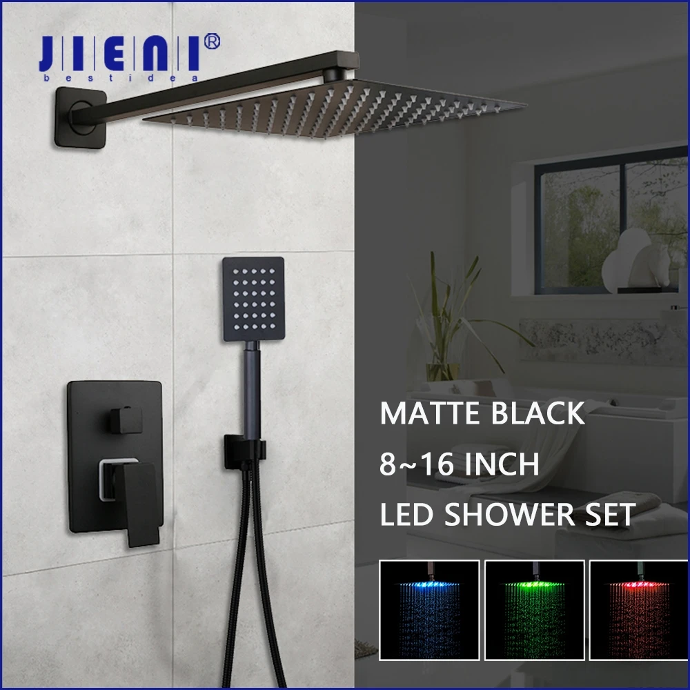 JIENI 8/16 pouces mat noir salle de bain robinet de douche mural noir LED pomme de douche mitigeur W/pluie robinet de douche ensemble