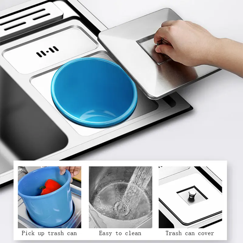 Éviers de cuisine à 3 compartiments en acier inoxydable 304 épaisseur de 1.2mm avec poubelle sur le comptoir ou Udermount.